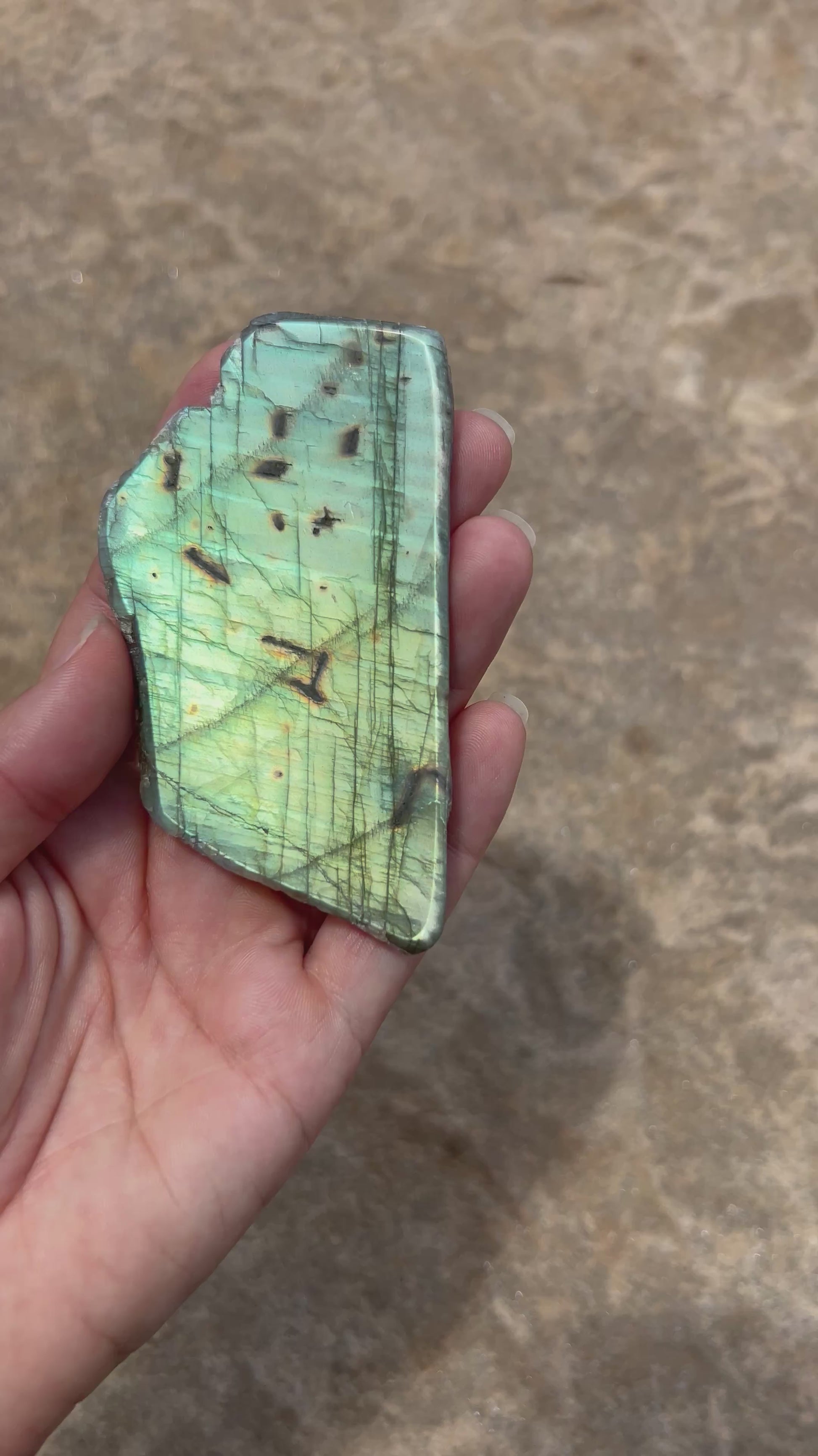 This Labradorite Slab has flash throughout the piece, front and back. As you shift the slab in light the flash changes from green to blue. If you get the slab just right the entire slab is green, and other angles its blue. This stunning specimen weighs 62g and measures 85mm x 47mm x 7mm. Polished face that highlights its brilliance and textured reverse side.