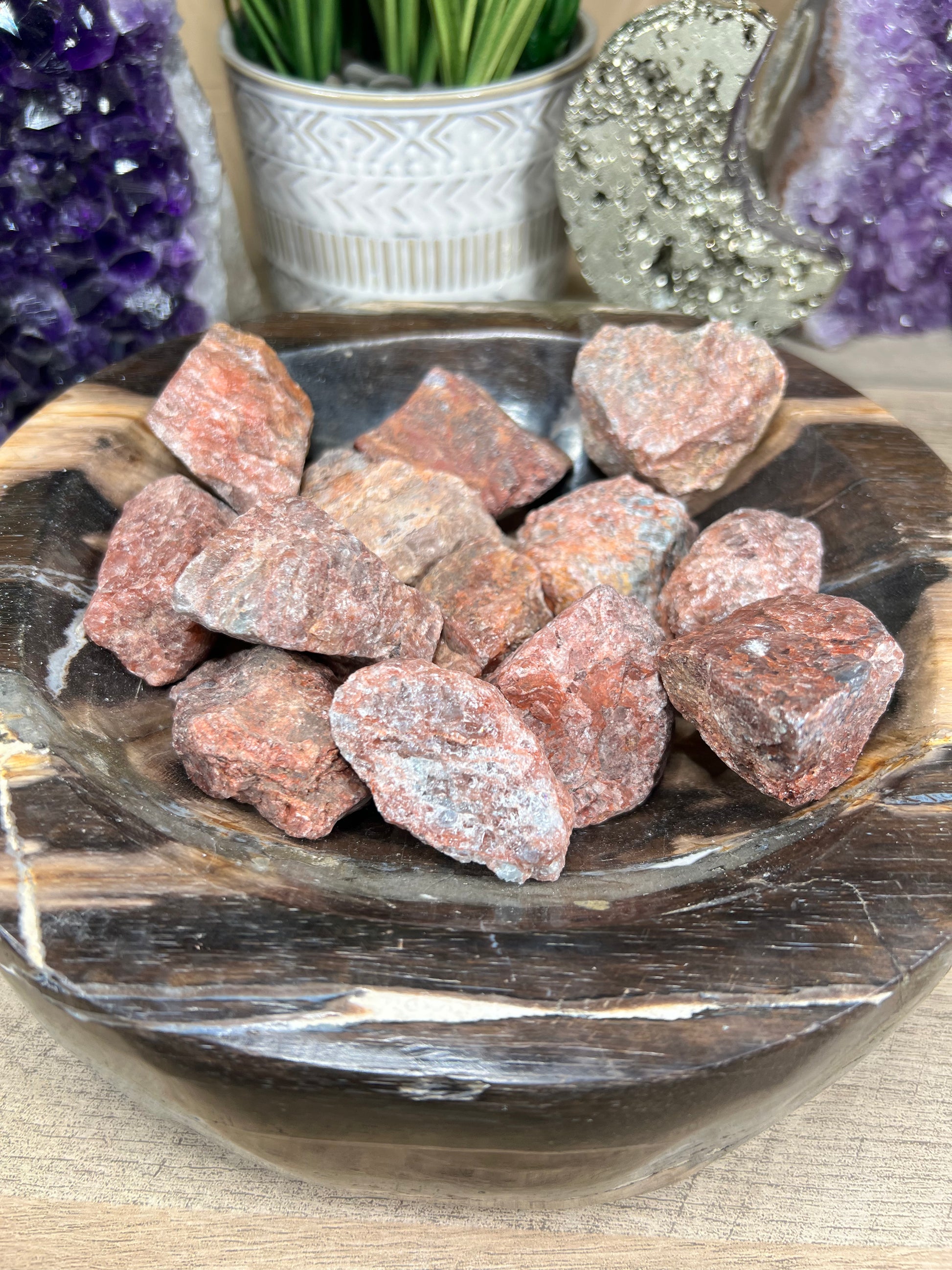 Hinweis: Dies sind Beispielfotos einiger der rohen Roten Apatite, die wir vorrätig haben. Jeder Rote Apatit ist anders und weist aufgrund seines natürlichen Ursprungs einzigartige Eigenschaften auf.