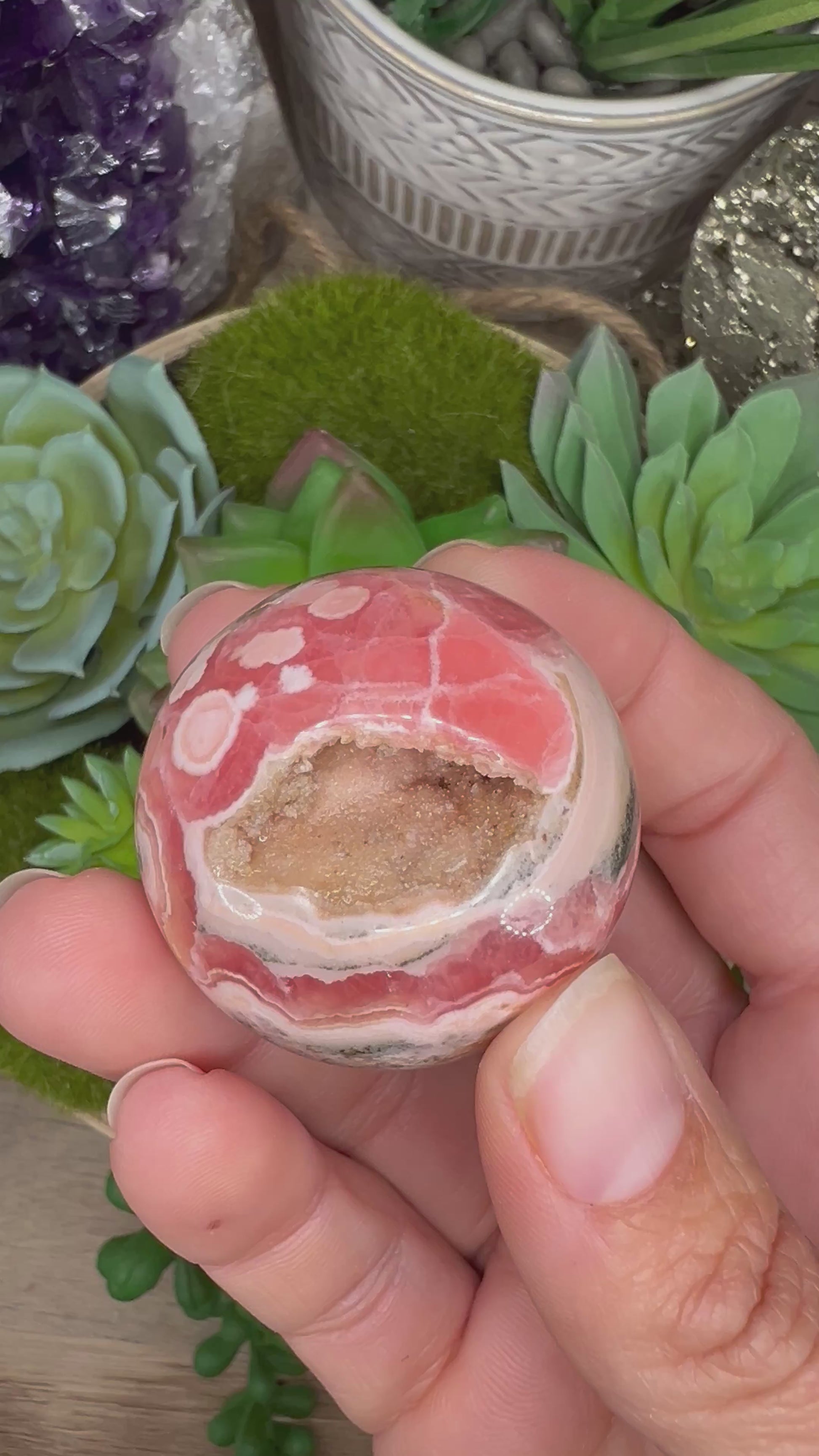 Capture the soothing warmth of Rhodochrosite with this beautifully polished sphere that features a cute druzy pocket. This sphere measures 36mm (1.41 in) in diameter and weighing 87g (3.07 oz). You will receive the exact sphere pictured, ensuring a truly one-of-a-kind addition to your collection. A convenient display stand is included for effortless showcasing.