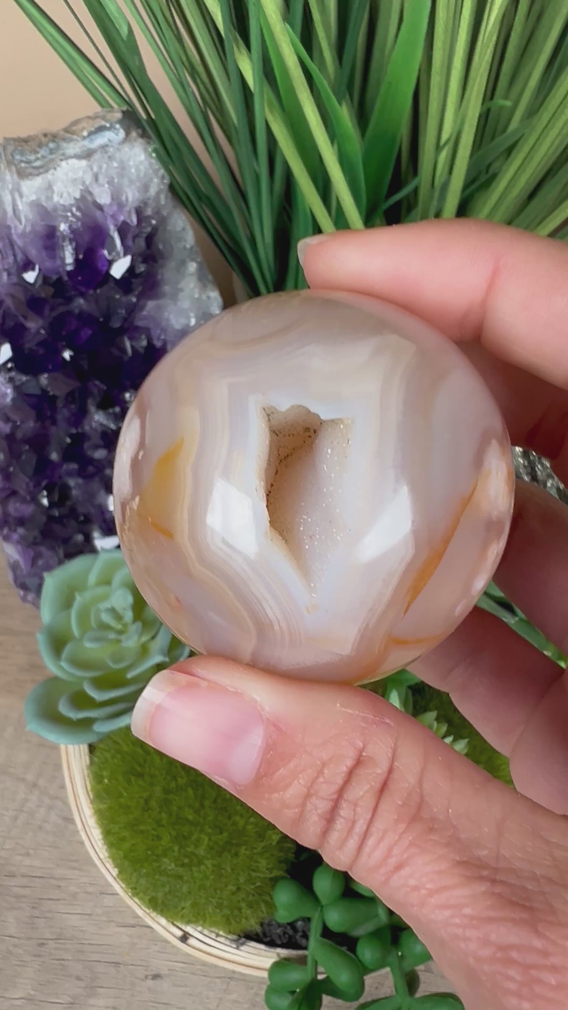 Our Flower Agate Sphere has a beautiful druzy pocket. This captivating piece, measuring approximately 50mm (2.0 inches) in diameter and weighing 175g (0.38 lbs), features unique, flower-like patterns that evoke the delicate beauty of a blooming garden. This gemstone is prized for its natural artistry and soothing energy. This stone is also known by the names: Blossom Agate, Blossom Jasper, Sakura, or Cherry Blossom Agate.
