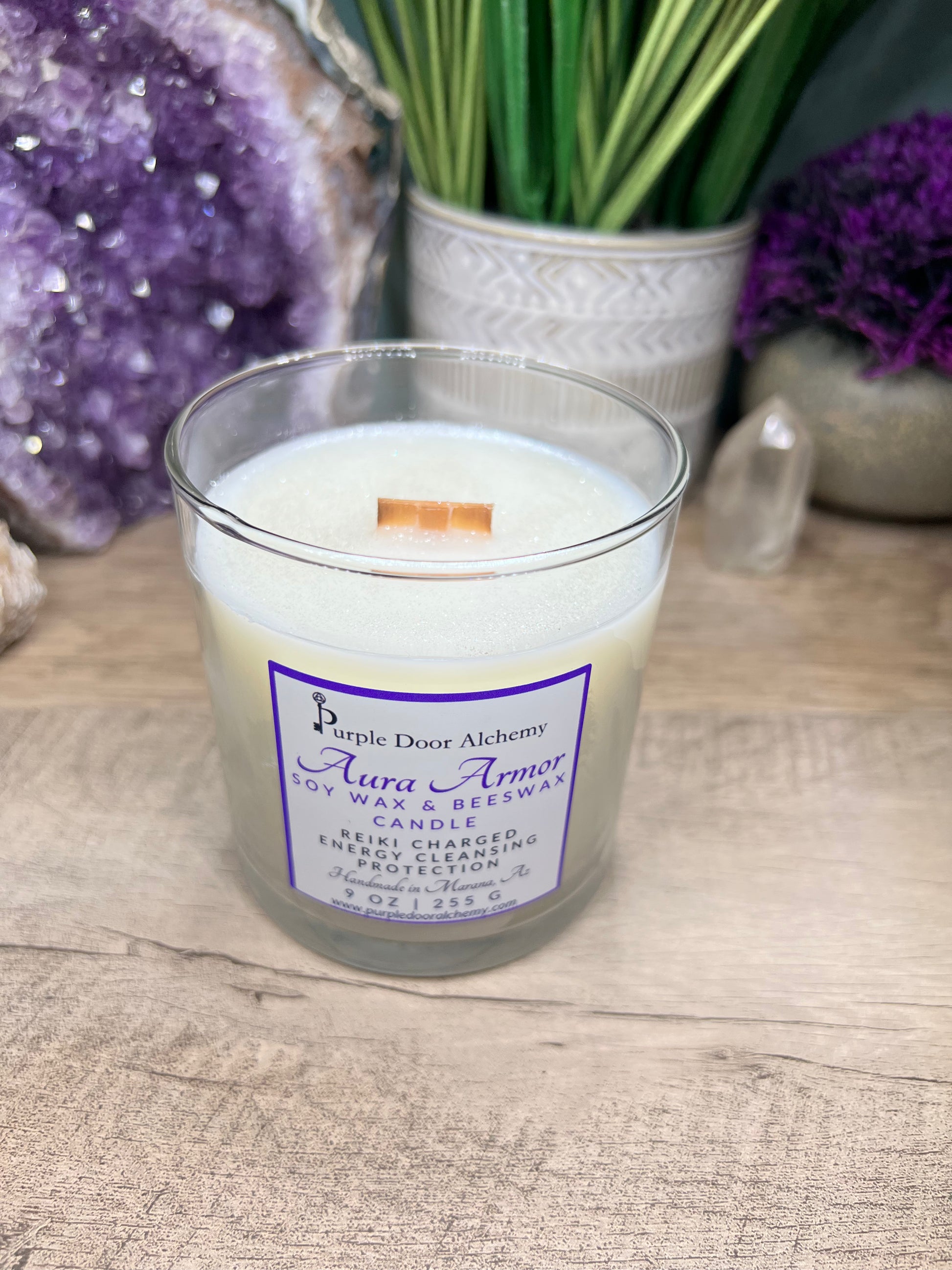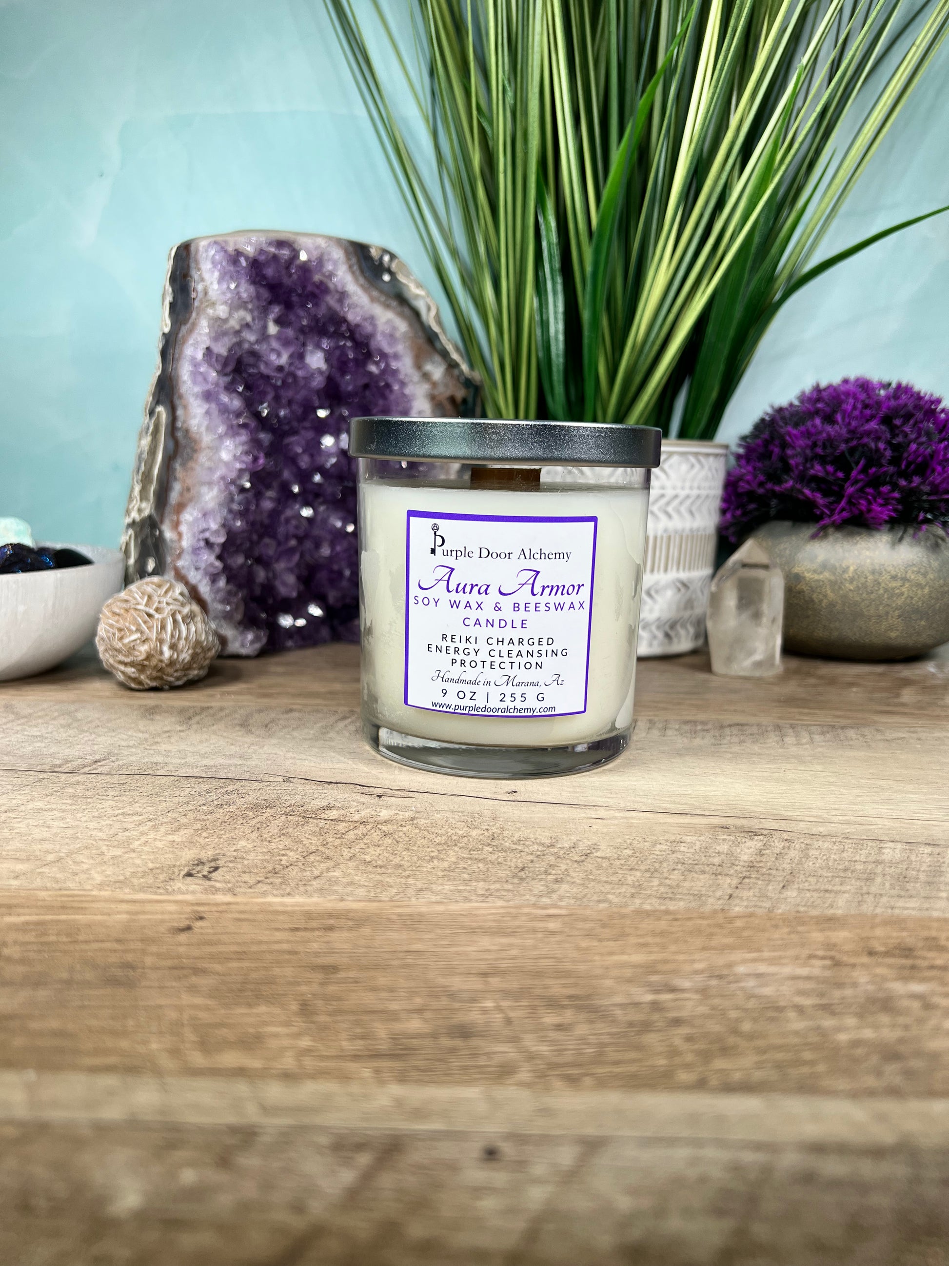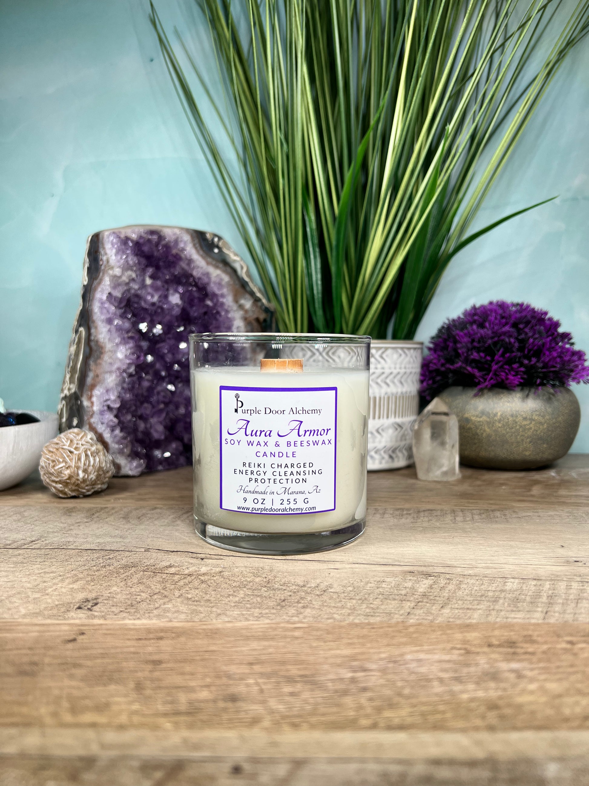 Aura Armor ist eine mit Reiki aufgeladene Kerze aus 255 g Sojawachs und Bienenwachs, die Ihren Raum und Ihre Aura durch Aromatherapie, natürliche Ionisierung und einen umweltfreundlichen Holzdocht reinigt. Diese Kerze wurde für die energetische Reinigung und den Schutz entwickelt. Sie beseitigt negative Energien und schützt die Energie Ihres heiligen Raumes, sodass nur positive Schwingungen zurückbleiben. Sie ist perfekt für Manifestationen, Zauberarbeit, Meditation, Chakrenausgleich und Yoga.