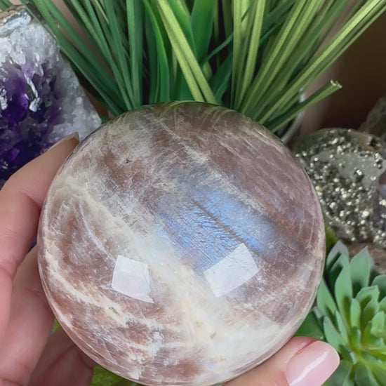 This one-of-a-kind sphere features a luminous blue Moonstone flash and sparkling Sunstone inclusions, creating a mesmerizing play of light that shifts with every angle.