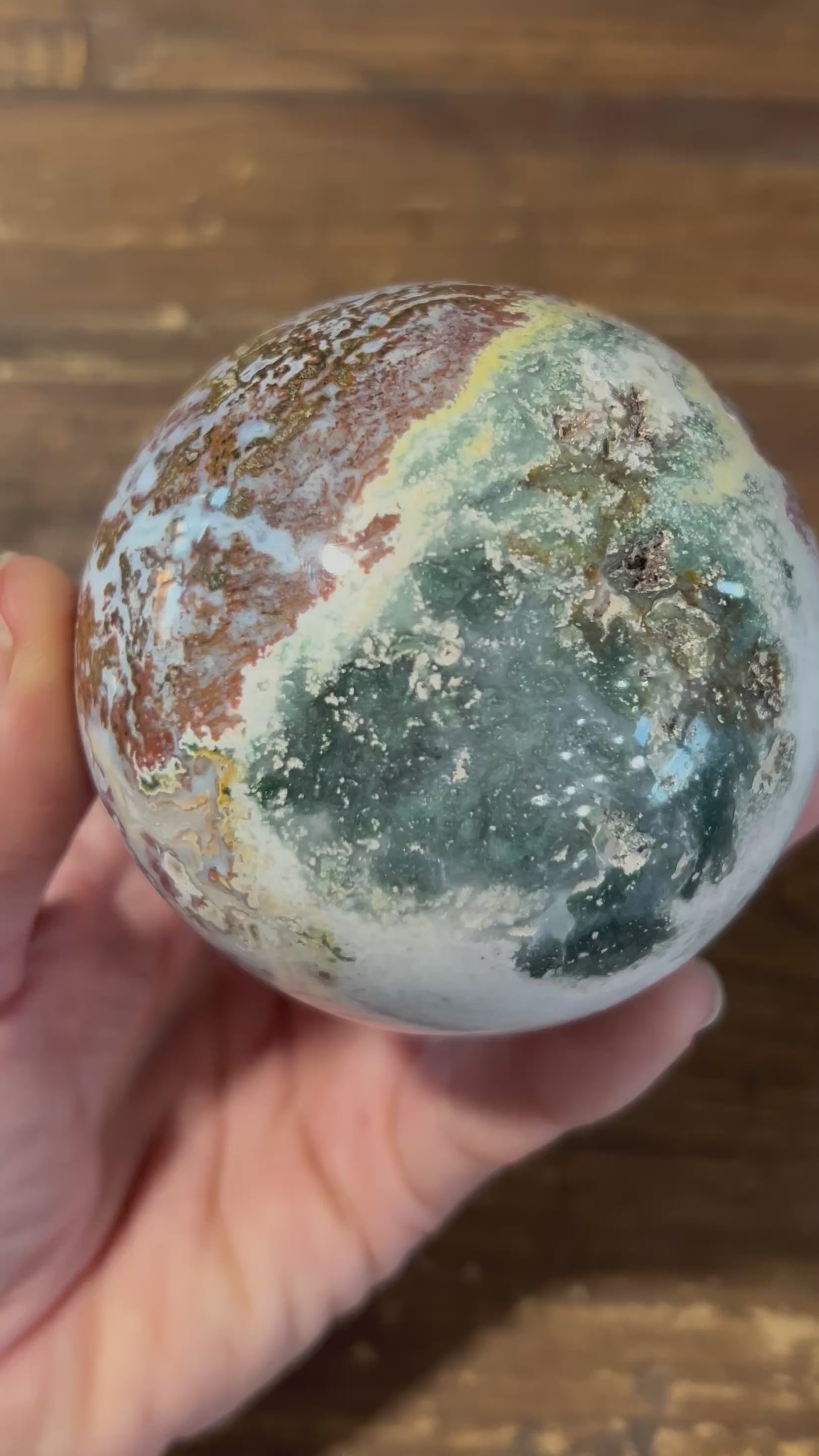 This beautiful Ocean Jasper Sphere is a harmonious blend of vibrant patterns and calming energy, perfect for any crystal collection or as a stunning decorative piece. Weighing 543 grams (1.20 lbs) and measuring 75 mm (2.95 in) in diameter, this sphere showcases Ocean Jasper's signature swirling colors and unique orbicular designs, creating a mesmerizing display. Comes with stand!