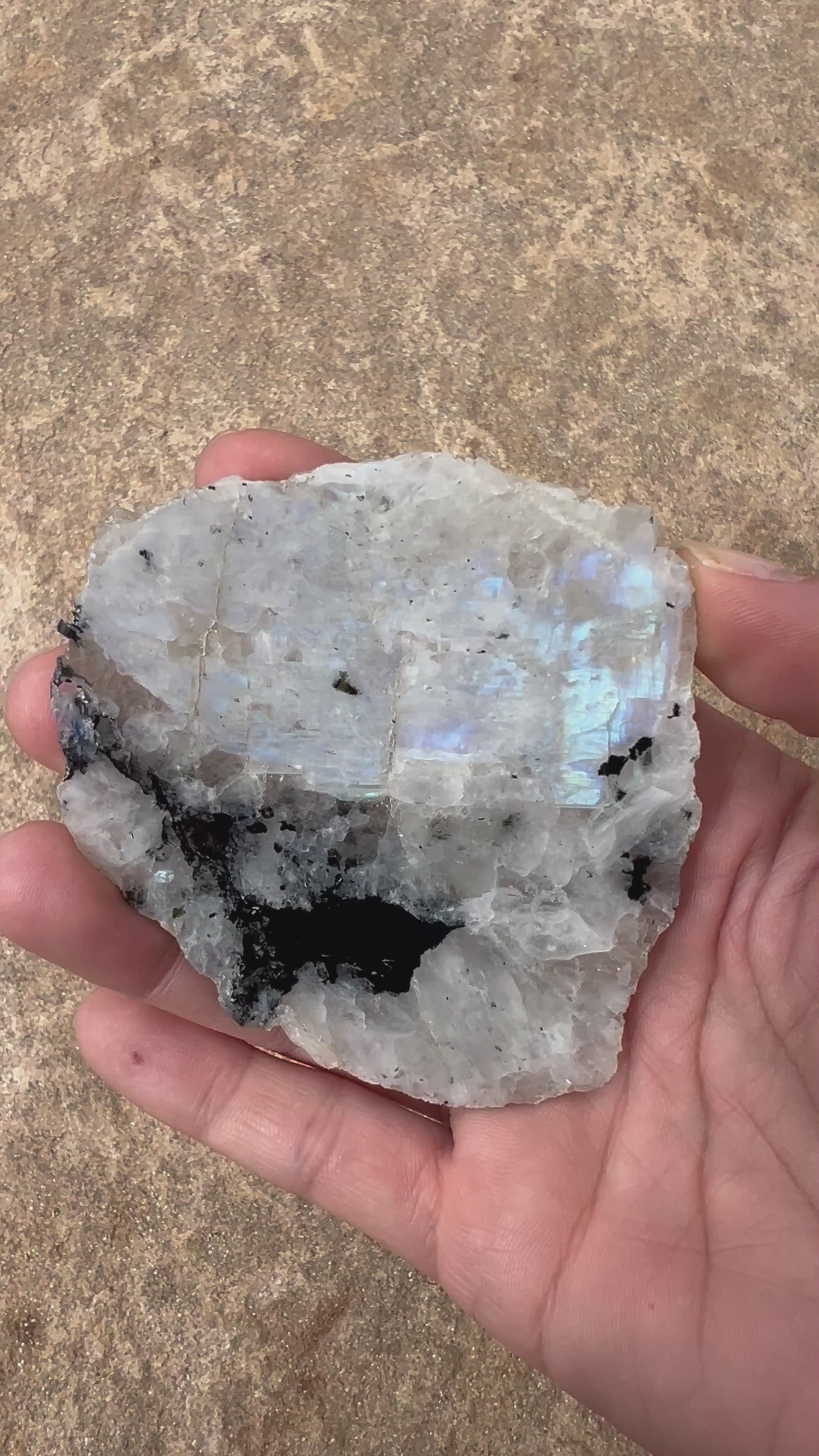 This Rainbow Moonstone Slab weighs 88g and measures 77mm x 74mm x 7.6mm. Polished on both sides to enhance its mesmerizing blue flash, this piece is a stunning addition to any collection. With Black Tourmaline and Smoky Quartz inclusions, this slab exhibits a unique contrast that makes it ideal for both lapidary work and as a collector’s display piece.
