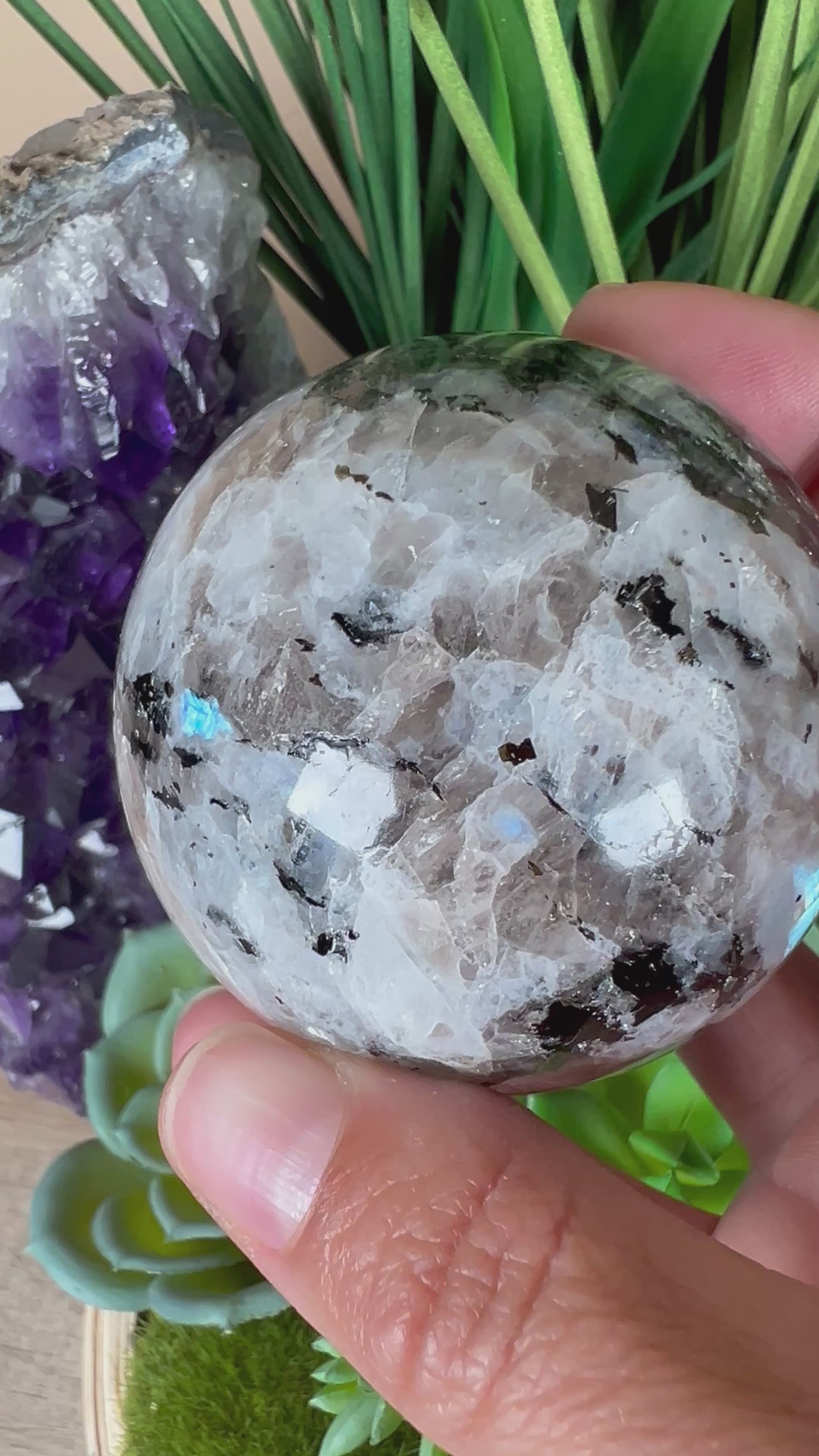 Our Rainbow Moonstone Sphere has a high polish and blue flashes throughout the sphere. This stunning sphere, measuring approximately 57mm (2.2 inches) in diameter and weighing 270g (0.59 lb), showcases the captivating, iridescent hues and mystical shimmer unique to Rainbow Moonstone. You will receive the exact sphere pictured, and it comes complete with a display stand for immediate showcasing.