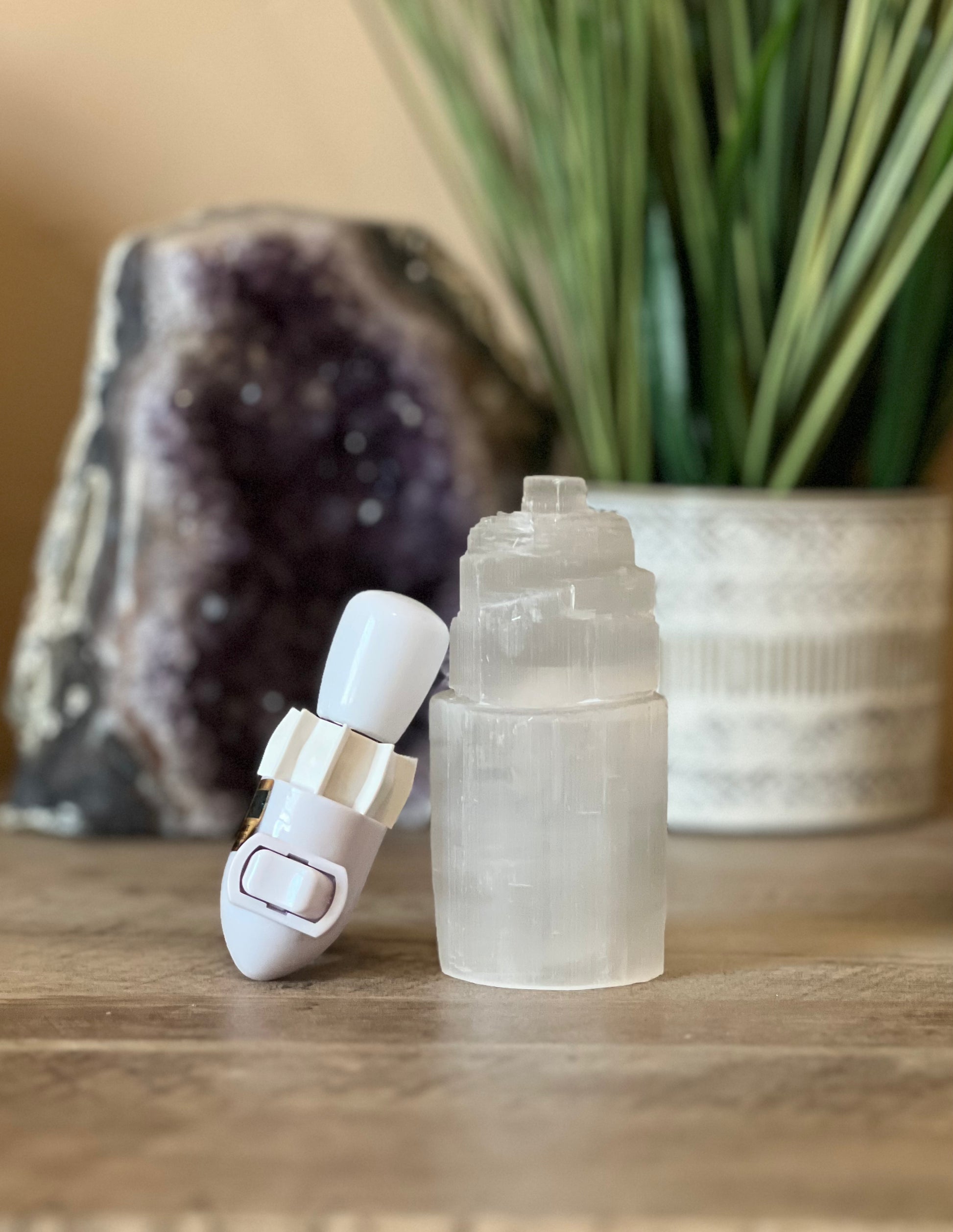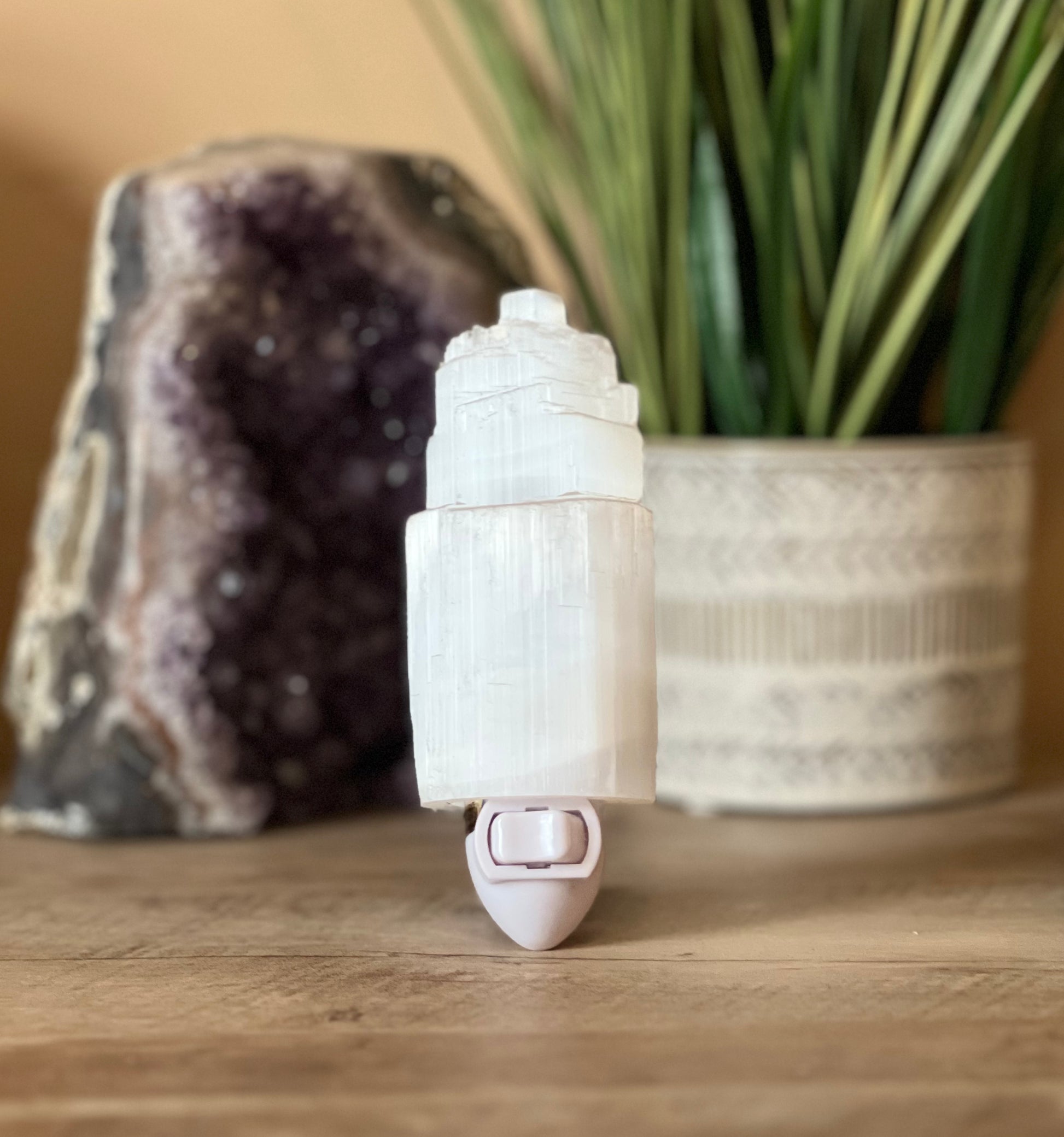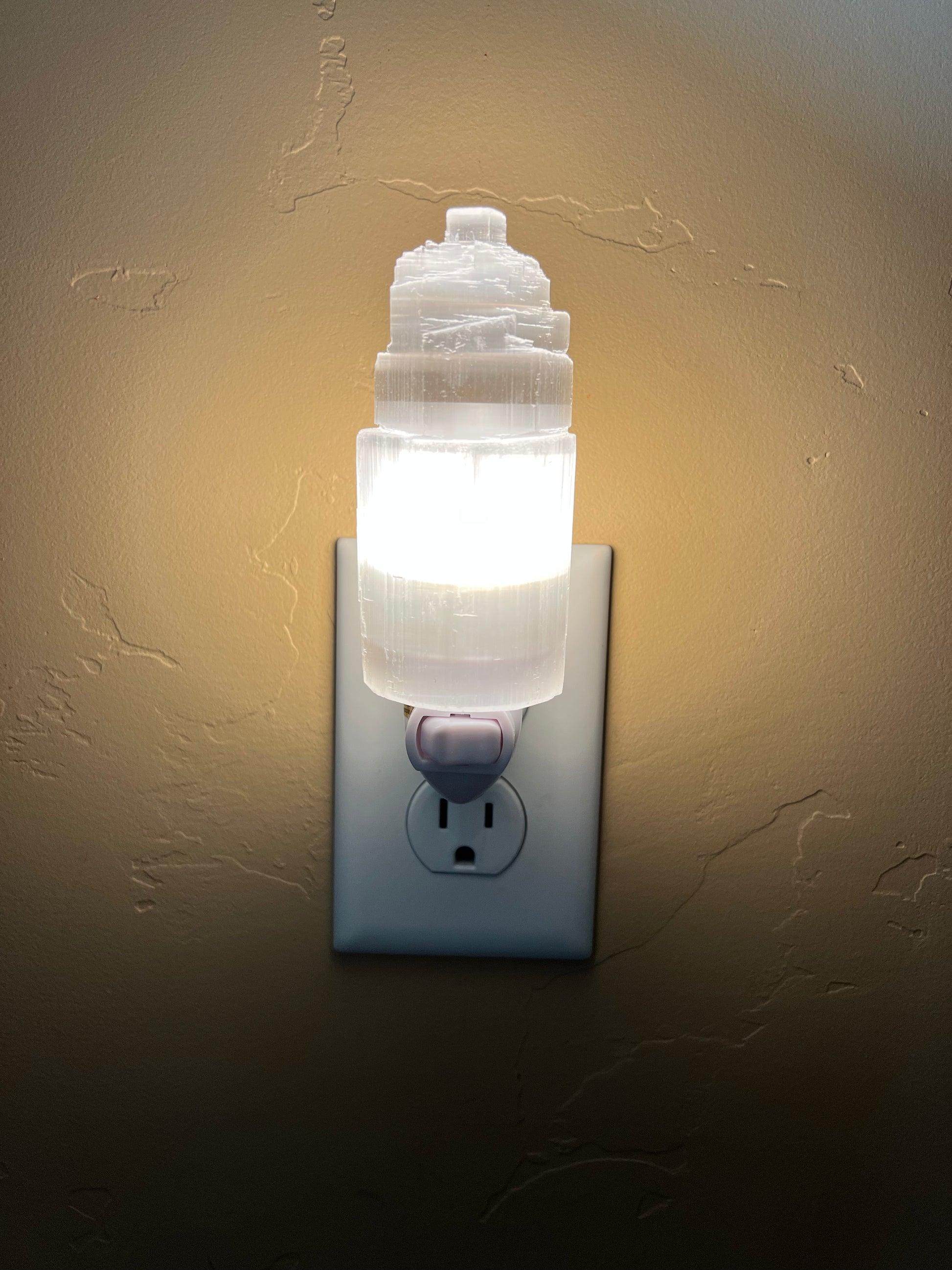 Jedes Set enthält 1 Selenit-Turm und 1 Nachtlicht-Stecker mit Ein-/Ausschalter sowie eine LED-Lampe.
