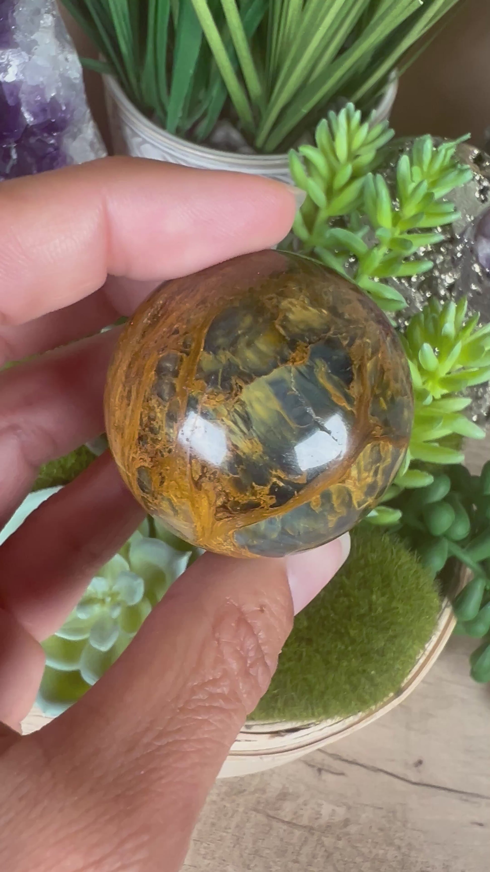 Nellite is the mesmerizing fusion of Tiger’s Eye and Pietersite, it is also known as Lionskin. Measuring 40mm (1.57") in diameter and weighing 95g (3.2 oz), this striking piece showcases swirling patterns of golden-brown and deep chatoyant blues. You will receive the exact sphere pictured, and a stand is included for immediate display.