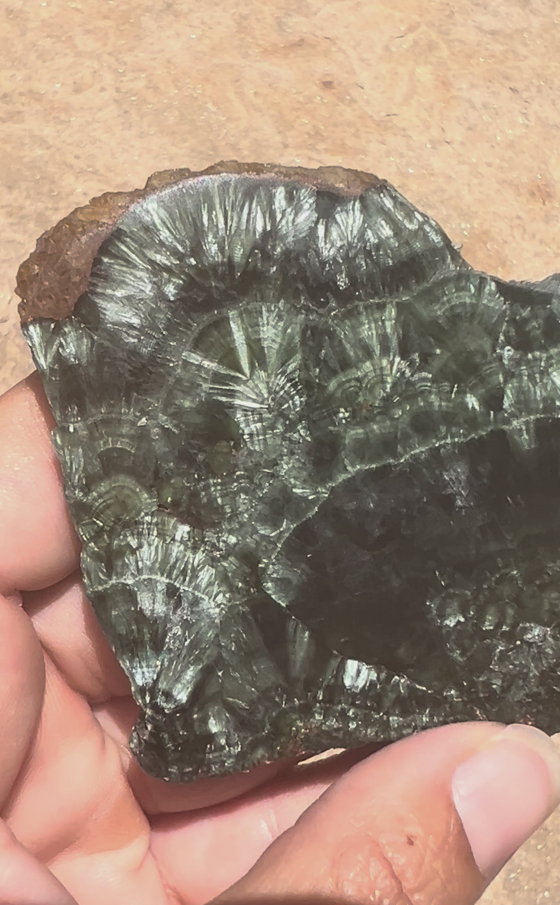 Our Seraphinite are from hand-selected rough rock that we cut in-house. Known for its striking deep green color and shimmering silver feathery patterns, Seraphinite is a rare and sought-after stone from the Lake Baikal region in Siberia, Russia. The slab is unpolished and photographed wet to showcase its natural luster and detail. Photos include both the front and back sides to highlight the unique characteristics of each piece. The video shows the slab dry and in natural sunlight.