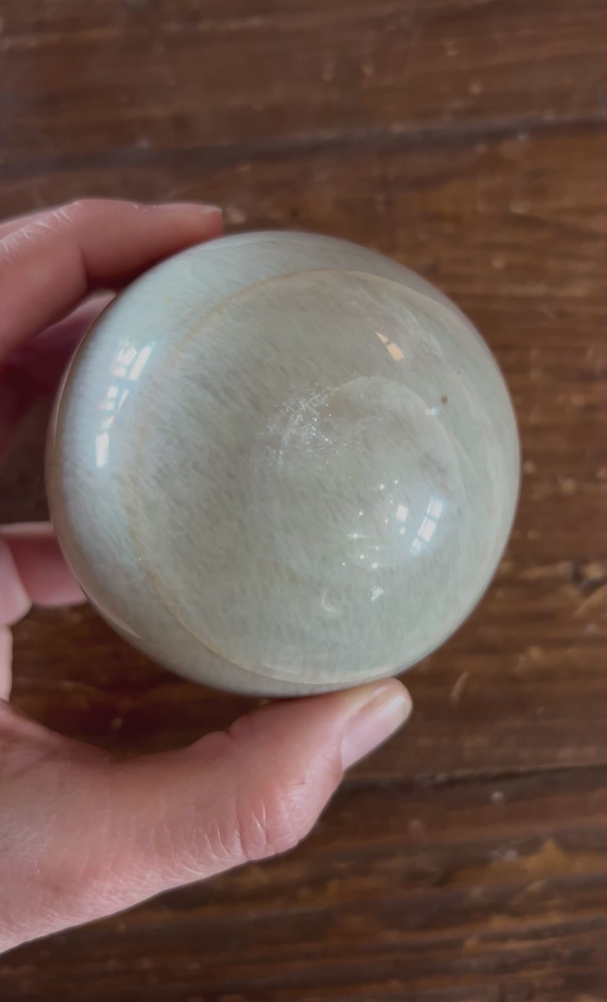 Immerse yourself in the serene and grounding energy of this Green Moonstone Sphere, a remarkable crystal known for its soft, calming hues and mystical properties. Weighing 545 grams (1.2 lbs) and measuring 73 mm (2.87 in) in diameter, this sphere is a captivating addition to any crystal collection or sacred space.