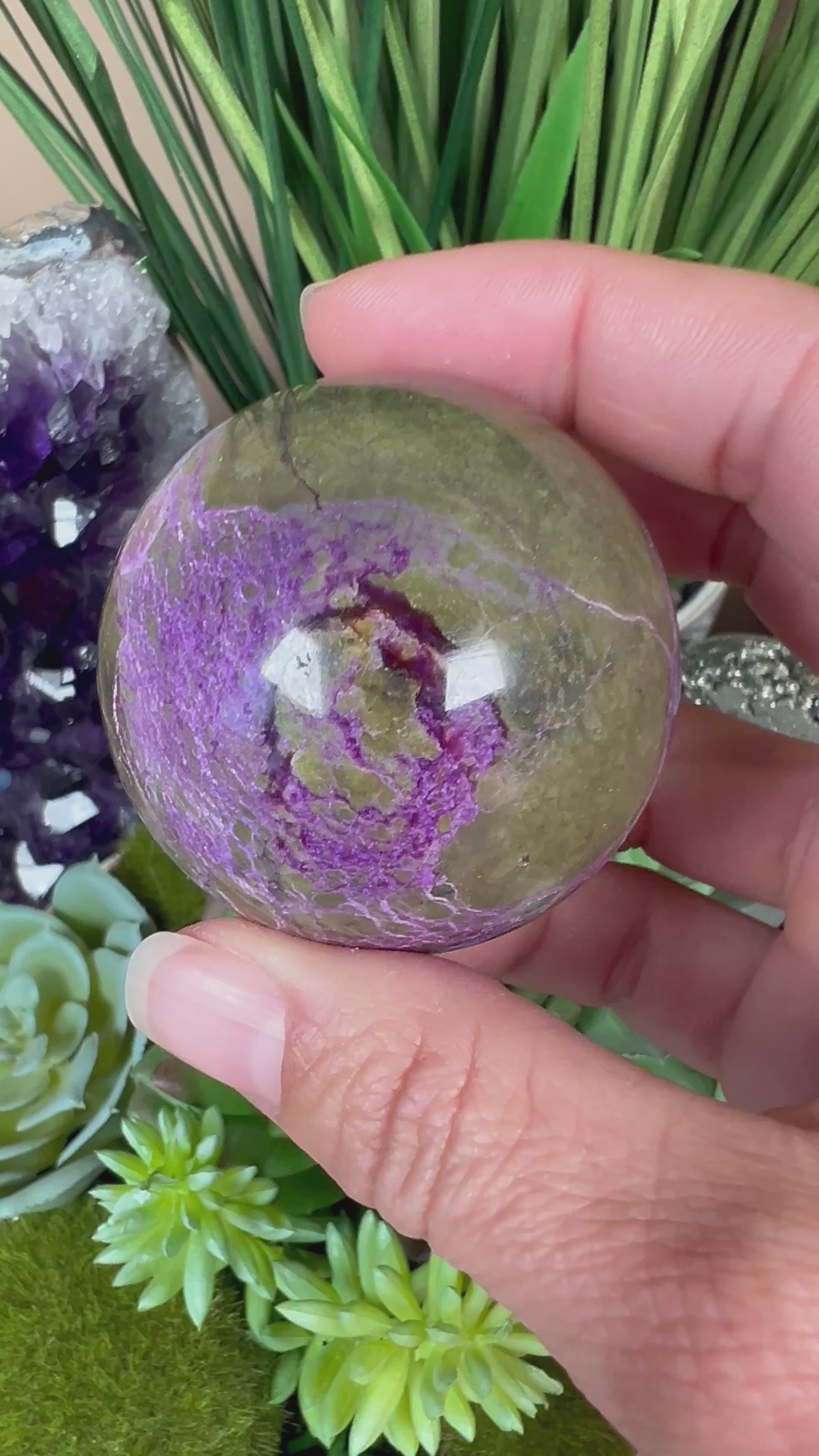 Atlantisite is a rare gemstone hailing from South Africa. This exquisite sphere measures approximately 48mm (1.89 inches) in diameter and weighs 140g (4.93 oz), embodying a unique fusion of chatoyant Stitchite and Green Serpentine. The result is a striking interplay of shimmering, dynamic patterns combined with rich, earthy tones that captivate the eye and inspire the spirit. The sphere will come in a gift box, and with a stand.