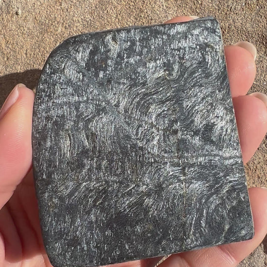 This striking Hypersthene Slab showcases the deep charcoal to silvery-black tones that Hypersthene is known for, often displaying a subtle metallic sheen when light hits its surface. This slab was cut in-house from hand-selected rough rock. Left unpolished in its natural state, this slab is perfect for lapidary work, cabochon cutting, carving, or as a raw mineral specimen for collectors.