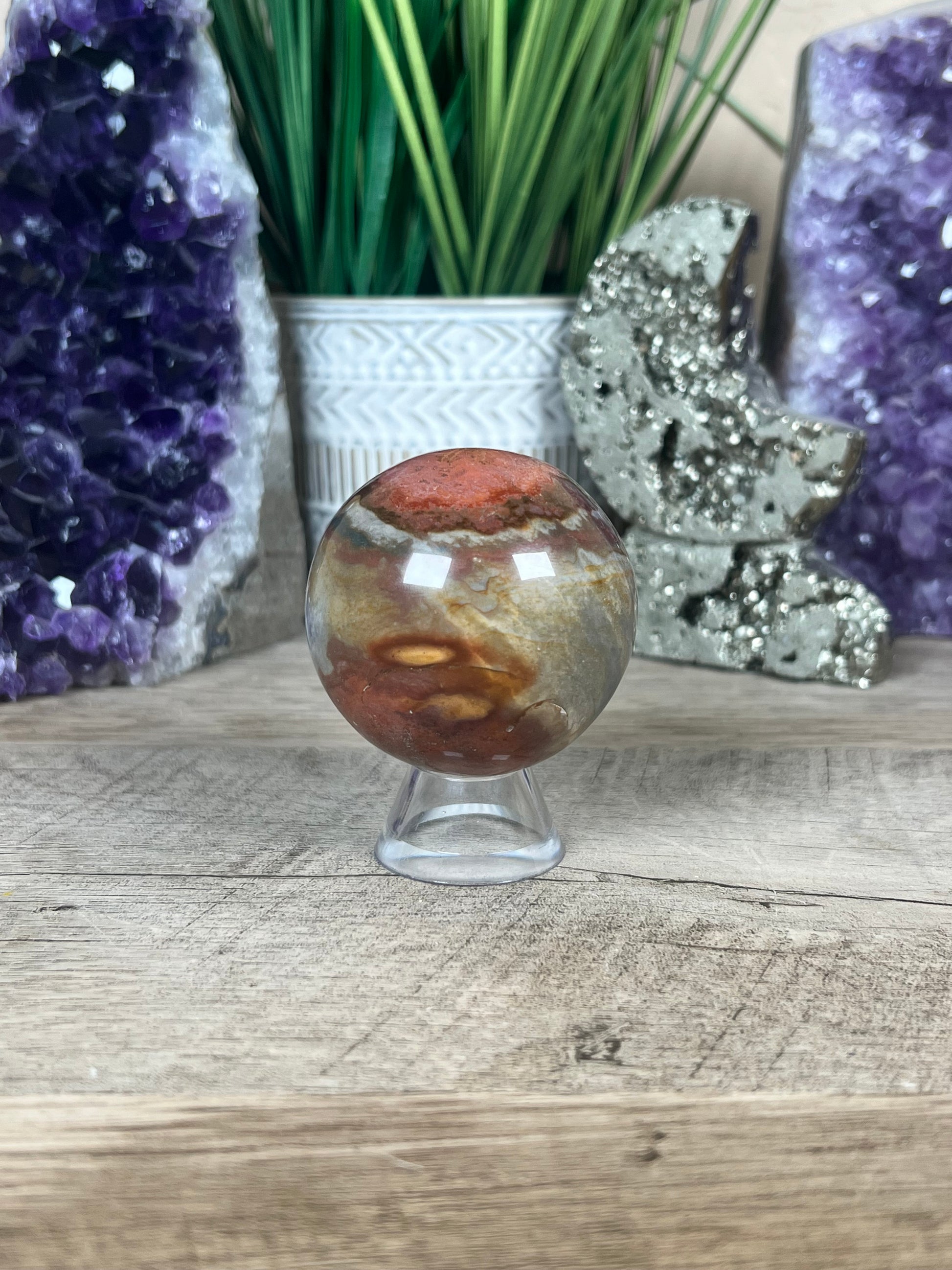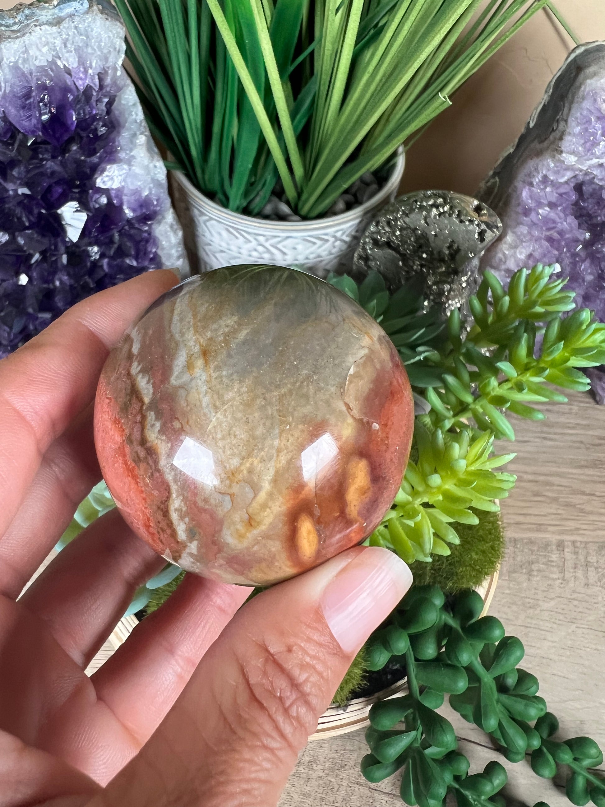 This Polychrome Jasper Sphere is an exquisite piece for crystal collectors, nature enthusiasts, or anyone seeking a grounding and energizing addition to their surroundings. Its beauty and energy make it a perfect gift or a cherished centerpiece for your space.