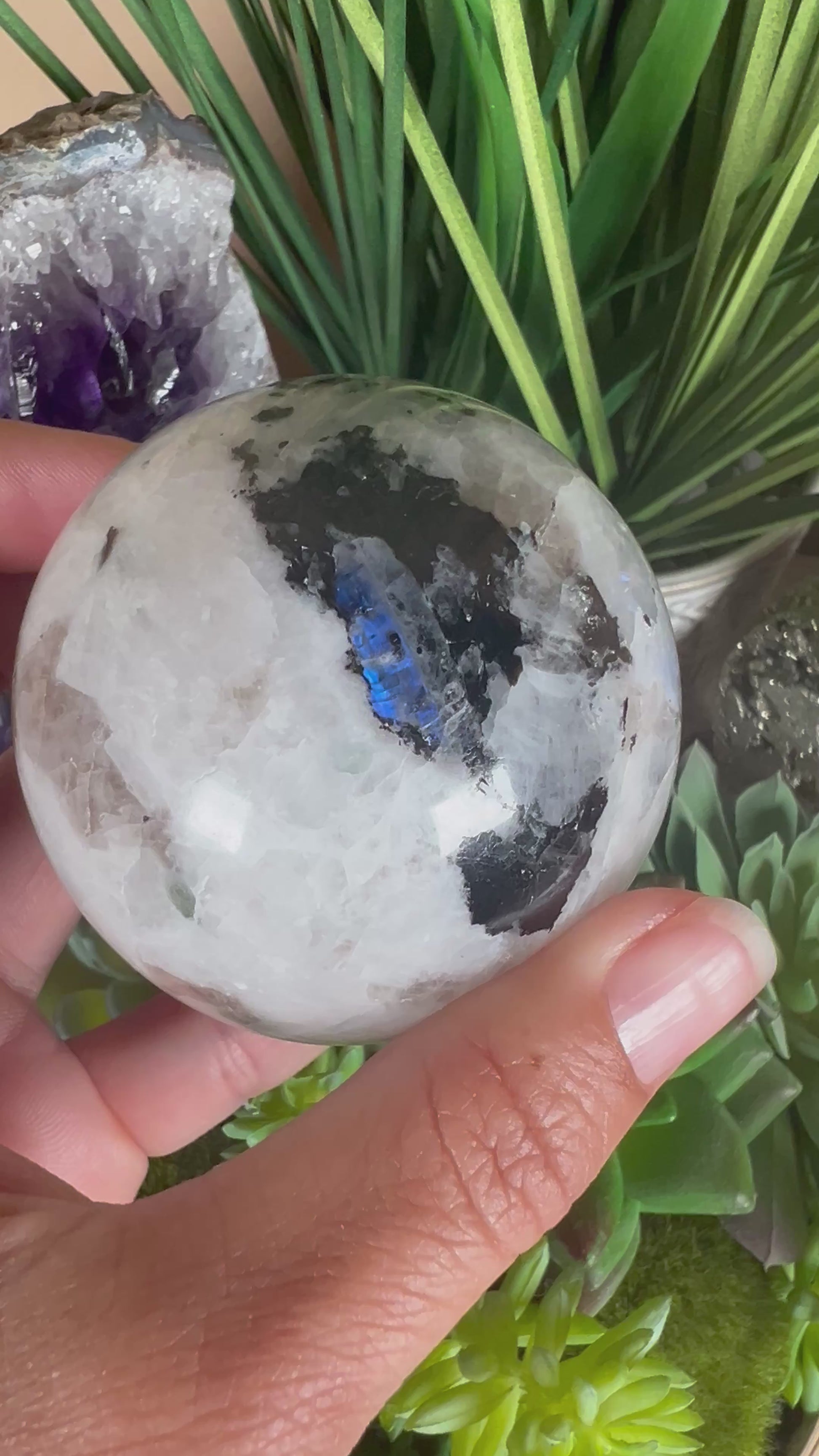 Our Rainbow Moonstone Sphere has a high polish and blue flashes throughout the sphere. This stunning sphere, measuring approximately 59mm (2.3 inches) in diameter and weighing 290g (0.64 lb), showcases the captivating, iridescent hues and mystical shimmer unique to Rainbow Moonstone. You will receive the exact sphere pictured, and it comes complete with a display stand for immediate showcasing.