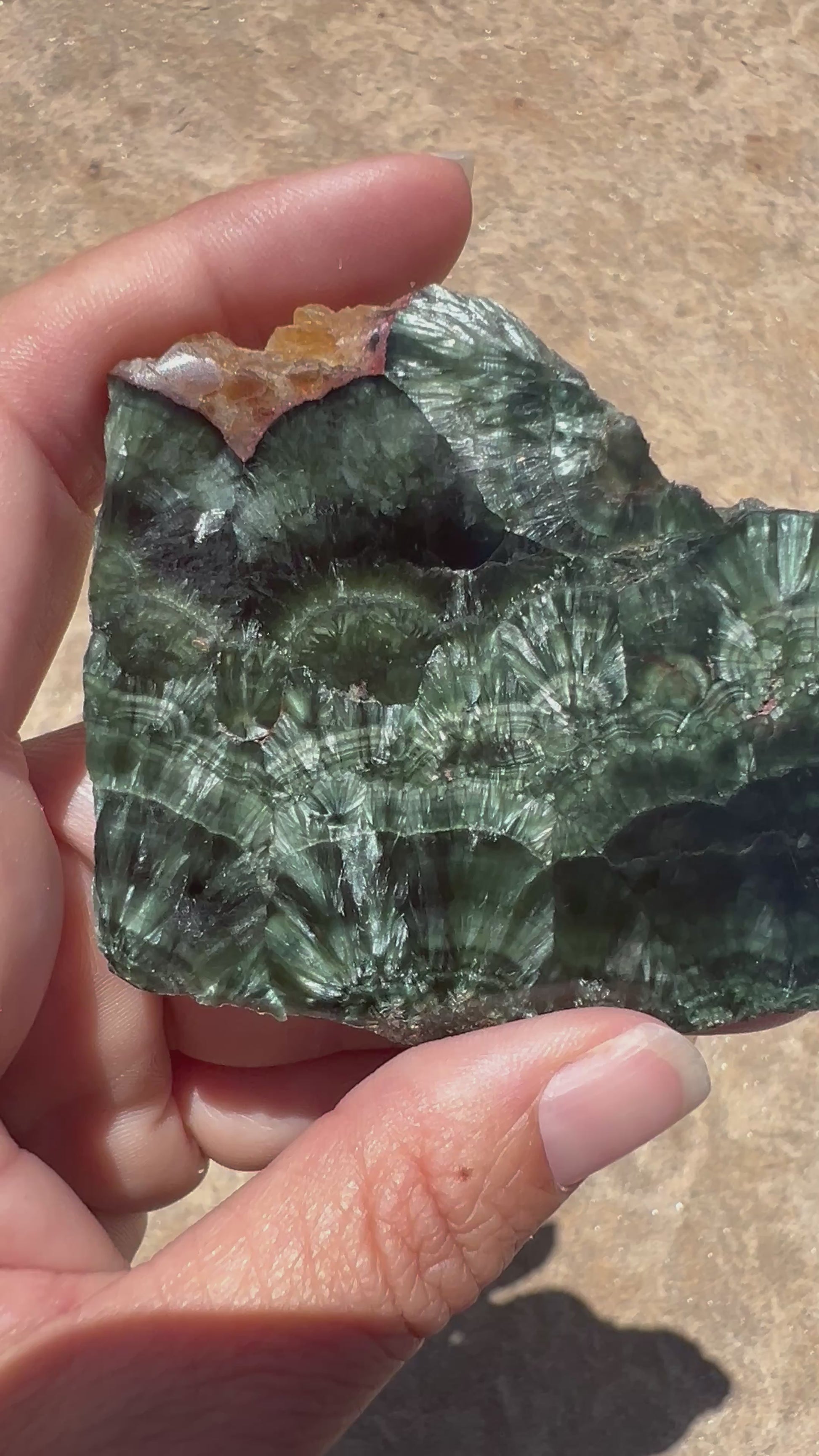 Our Seraphinite are from hand-selected rough rock that we cut in-house. Known for its striking deep green color and shimmering silver feathery patterns, Seraphinite is a rare and sought-after stone from the Lake Baikal region in Siberia, Russia. The slab is unpolished and photographed wet to showcase its natural luster and detail. Photos include both the front and back sides to highlight the unique characteristics of each piece. The video shows the slab dry and in natural sunlight.