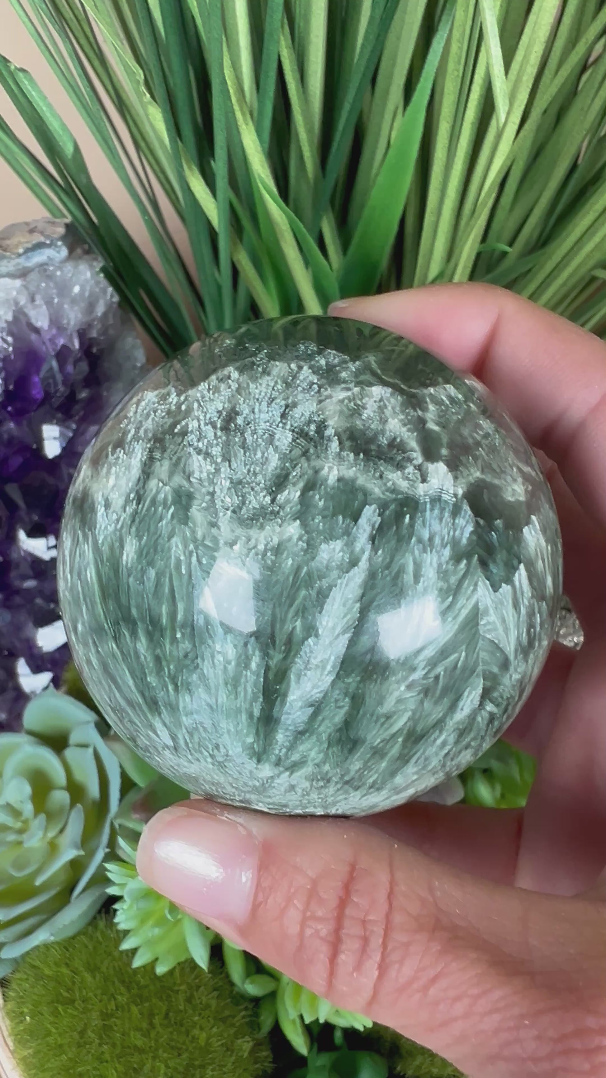 Our Seraphinite Sphere is a beautifully polished sphere that measures approximately 65mm (2.57 inches) in diameter and weighs 373g (13.16 oz), offering a perfect balance of elegance and uplifting spiritual energy. It is known for its chatoyant feathered appearance and vibrant green hues, Seraphinite is cherished for its connection to higher realms and its gentle, healing vibrations. Your sphere will be packaged in a gift box and comes with a stand!