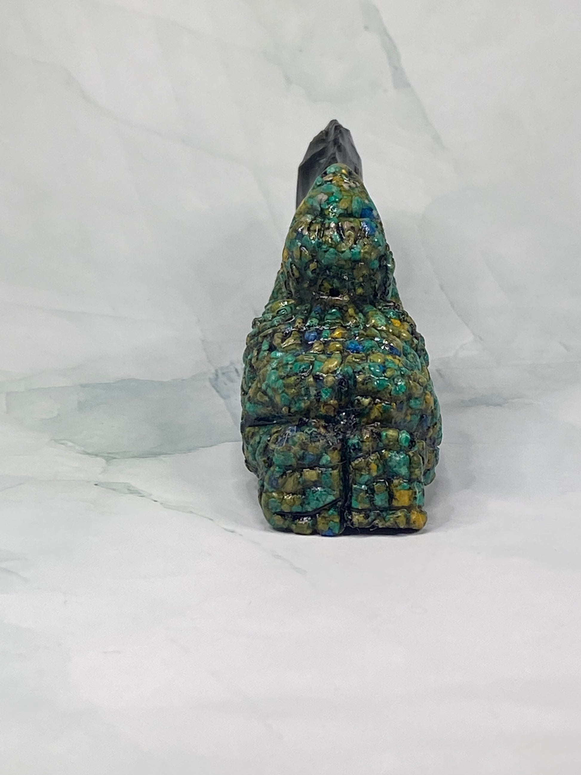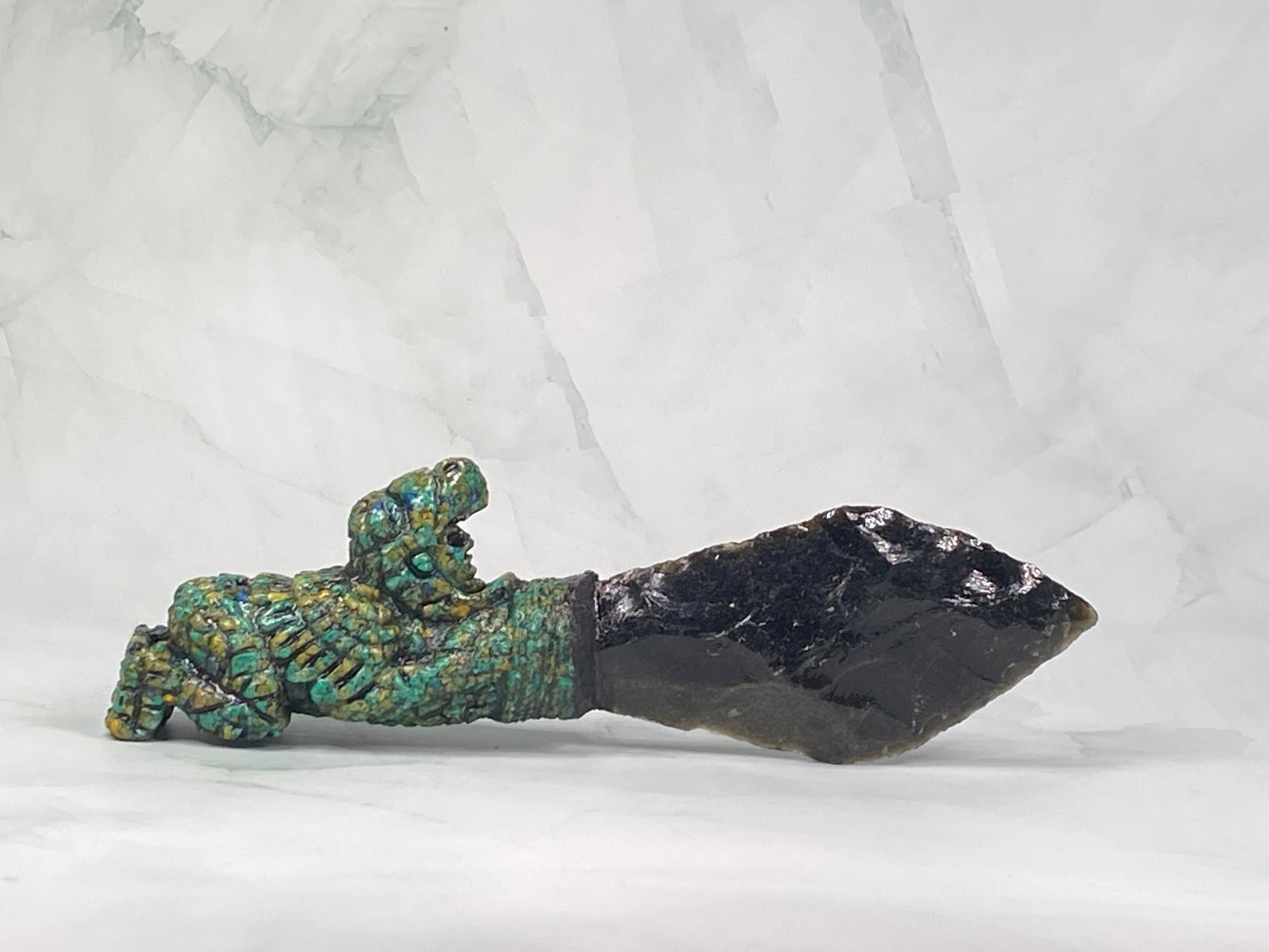 Le poignard est fabriqué à partir de minéraux provenant du Mexique : l’obsidienne Goldsheen, sculptée à la main, forme la lame, et le manche est fait de malachite, de chrysocolle et de sable d’azurite moulés dans de la résine.