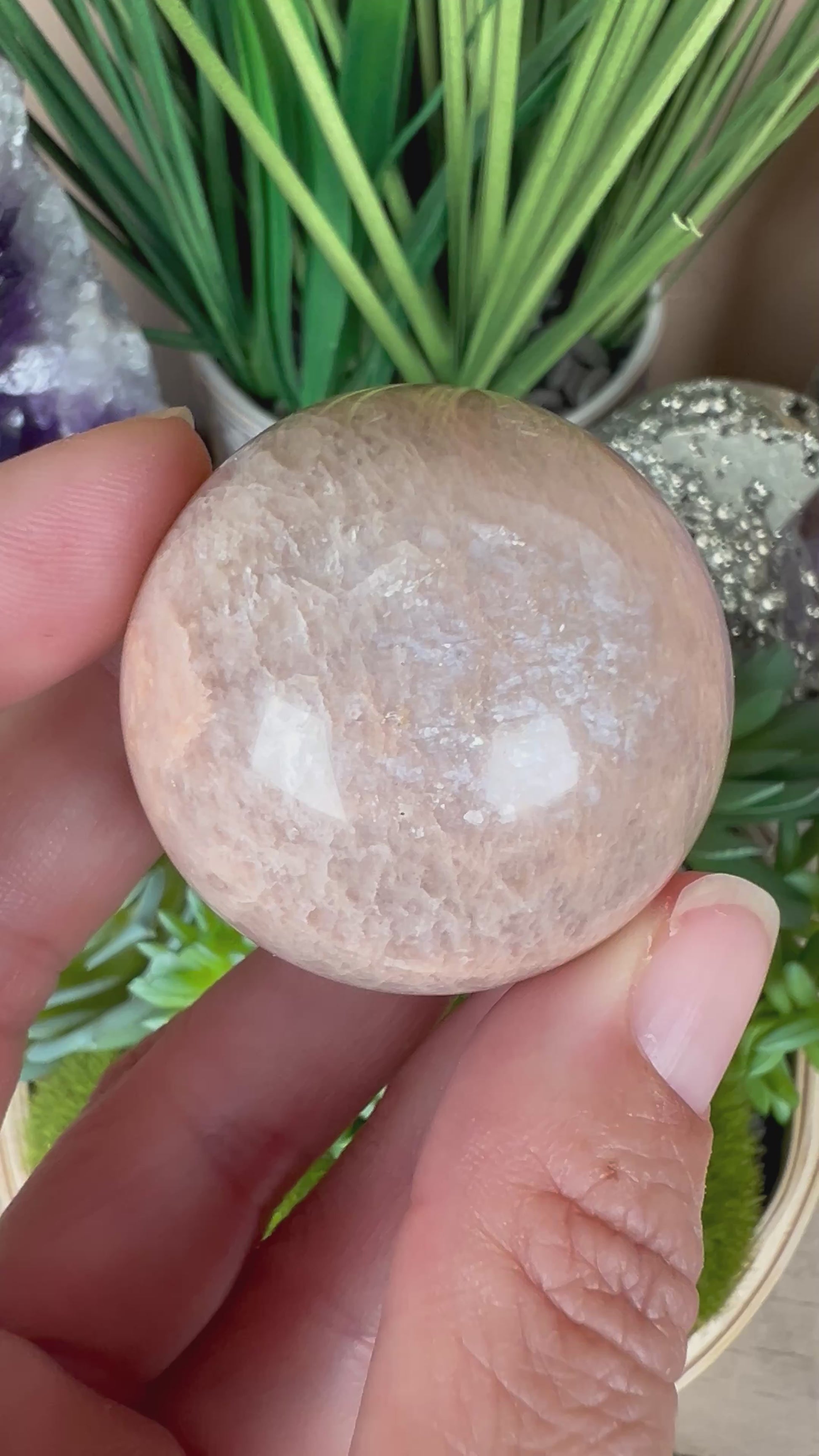This Peach Moonstone Sphere is a stunning blend of natural beauty and serene energy, making it an excellent choice for collectors, meditators, or as a heartfelt gift for someone special. Let its calming glow bring comfort and positivity into your life.