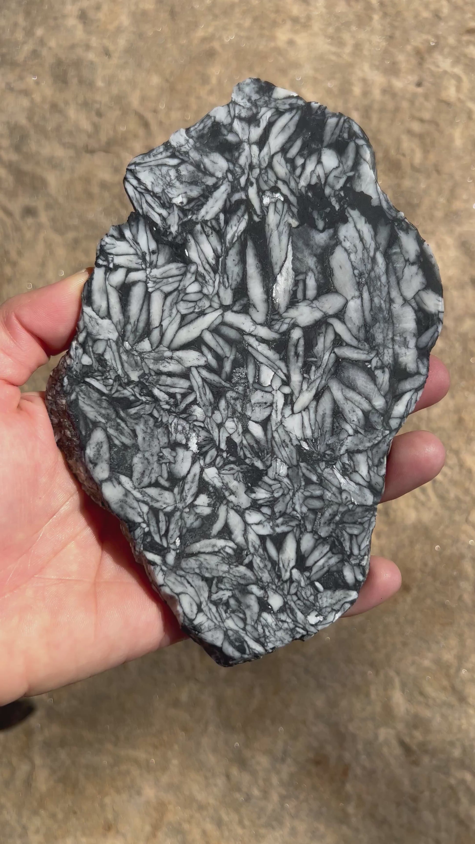 Our Pinolith Slab was carefully hand-selected from rough rock and expertly cut in-house to reveal ito unique textures and natural character. Each Pinolith slab is a one-of-a-kind piece that captures the essence of geological artistry, perfect for lapidary projects, decorative accents, or as a distinctive collectible. Photos show the slab wet and the video shows the slab dry in natural sunlight.