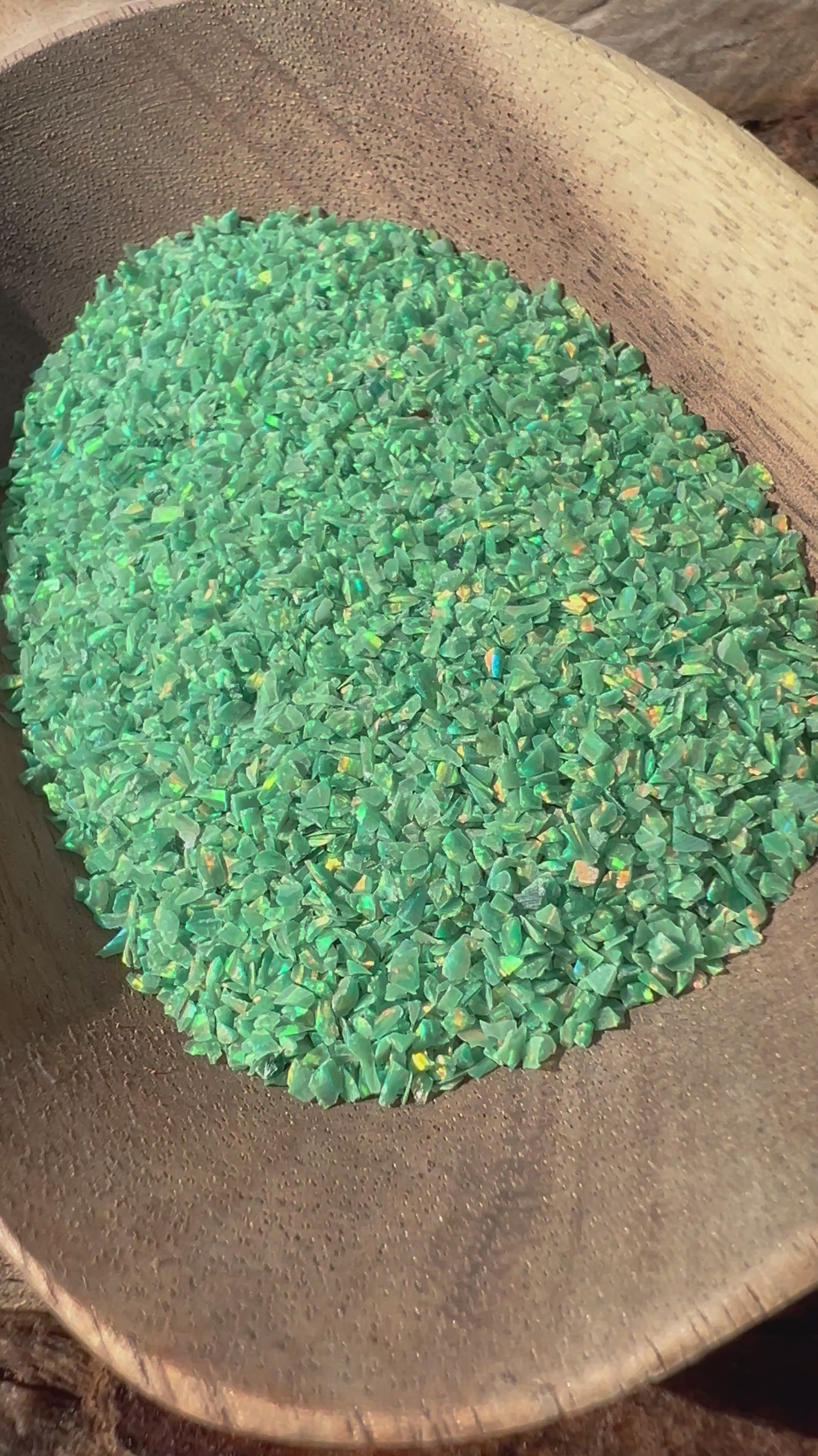 Infuse your projects with Crushed Synthetic Green Olive Opal. This green opal with hints of shimmering color is perfect for adding a pop of green fire-inspired energy to jewelry, inlay, and craft designs. The coarse 1-2mm fragments provide just the right amount of texture and sparkle, making this 1-gram offering ideal for those who love to work with unique, radiant materials.